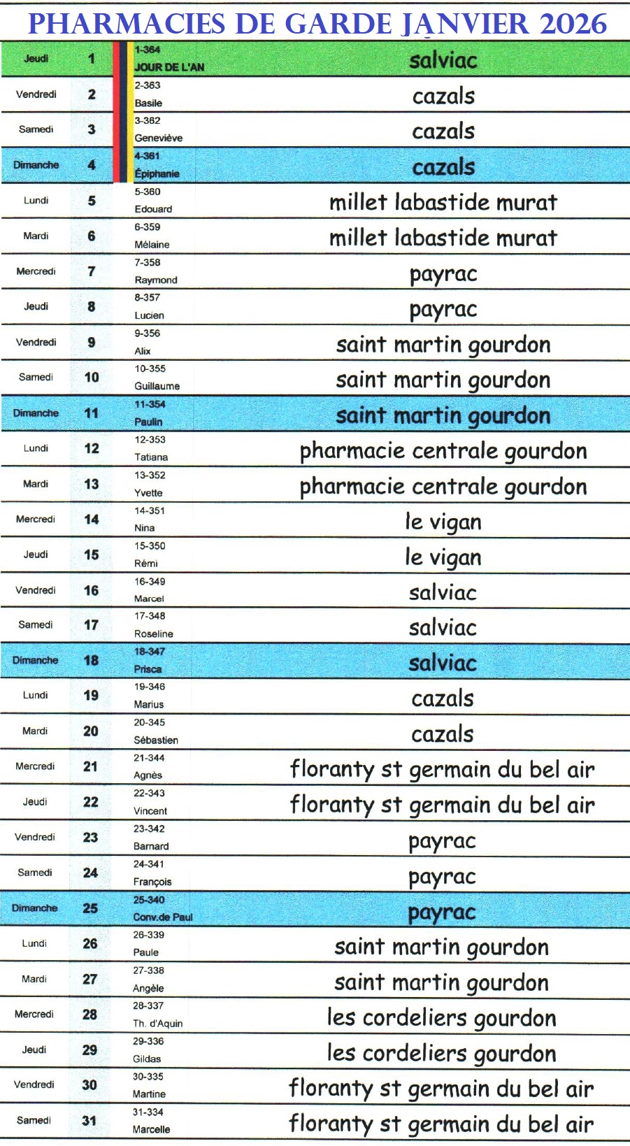 PLANNING DES PHARMACIES DE GARDE JANVIER 2026